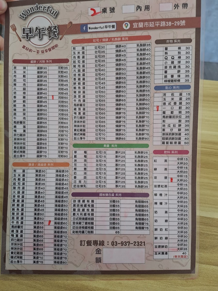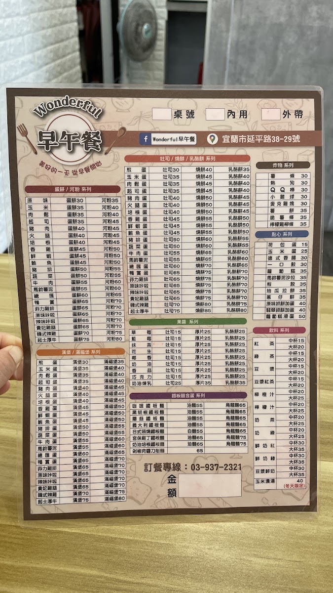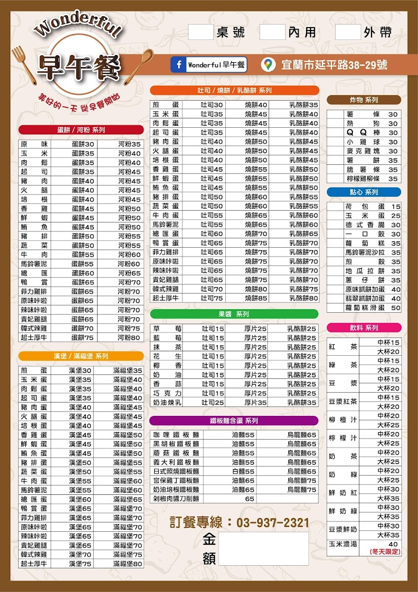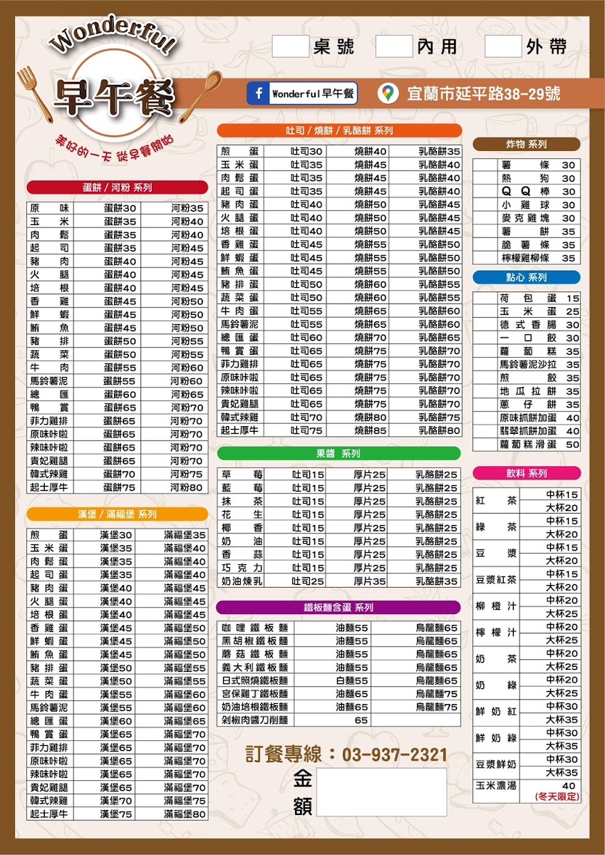 Wonderful Brunch offers a delightful selection of dishes that cater to various tastes. For those in the mood for something savory, the Tuna Egg Toast is a great choice, featuring a generous filling of fresh tuna and scrambled eggs between toasted bread. The café also boasts an array of well-executed toast varieties, perfect for a light, satisfying meal. For a sweet touch, customers can indulge in the restaurant's signature French Toast, a fluffy, caramelized treat that pairs perfectly with a drizzle of syrup. Each dish is made with quality ingredients, ensuring a flavorful and comforting experience. The prices are reasonable for the portions and the quality of food served. Overall, Wonderful Brunch’s menu is simple yet satisfying, offering a perfect spot for a relaxed meal in Yilan City.